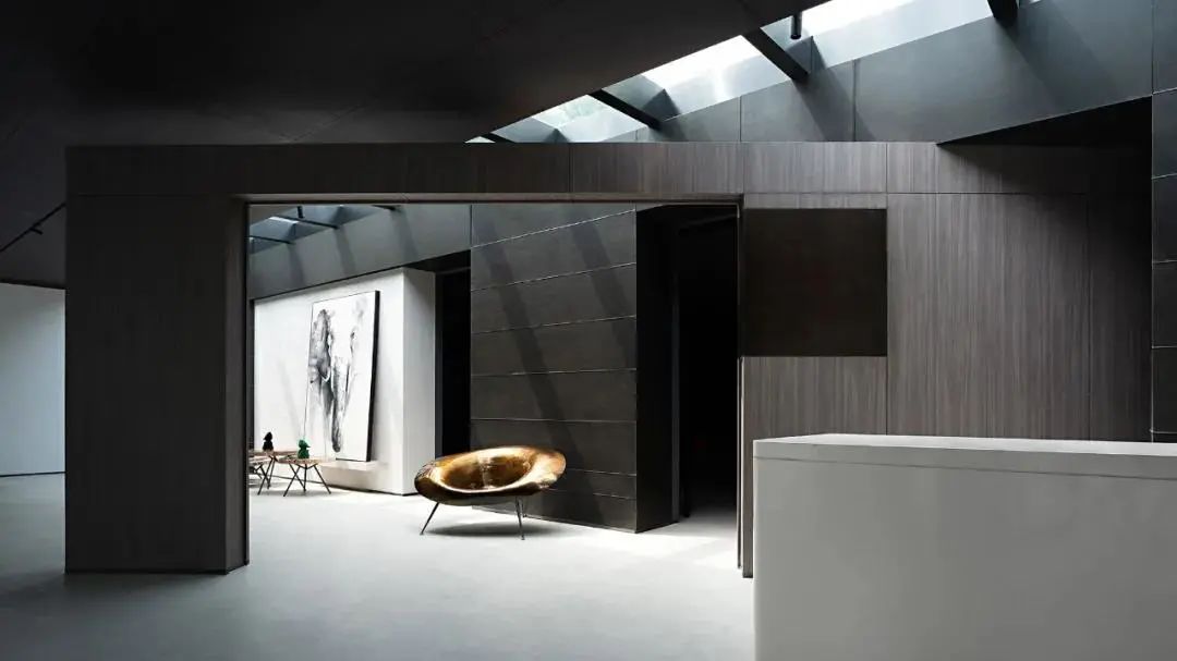 As the "door" to open the art gallery, a block structure of wood and metal splicing presents the artistic scale of mirror image in the space again. The designer gives different scenery and artistic conception to both sides of the "door".